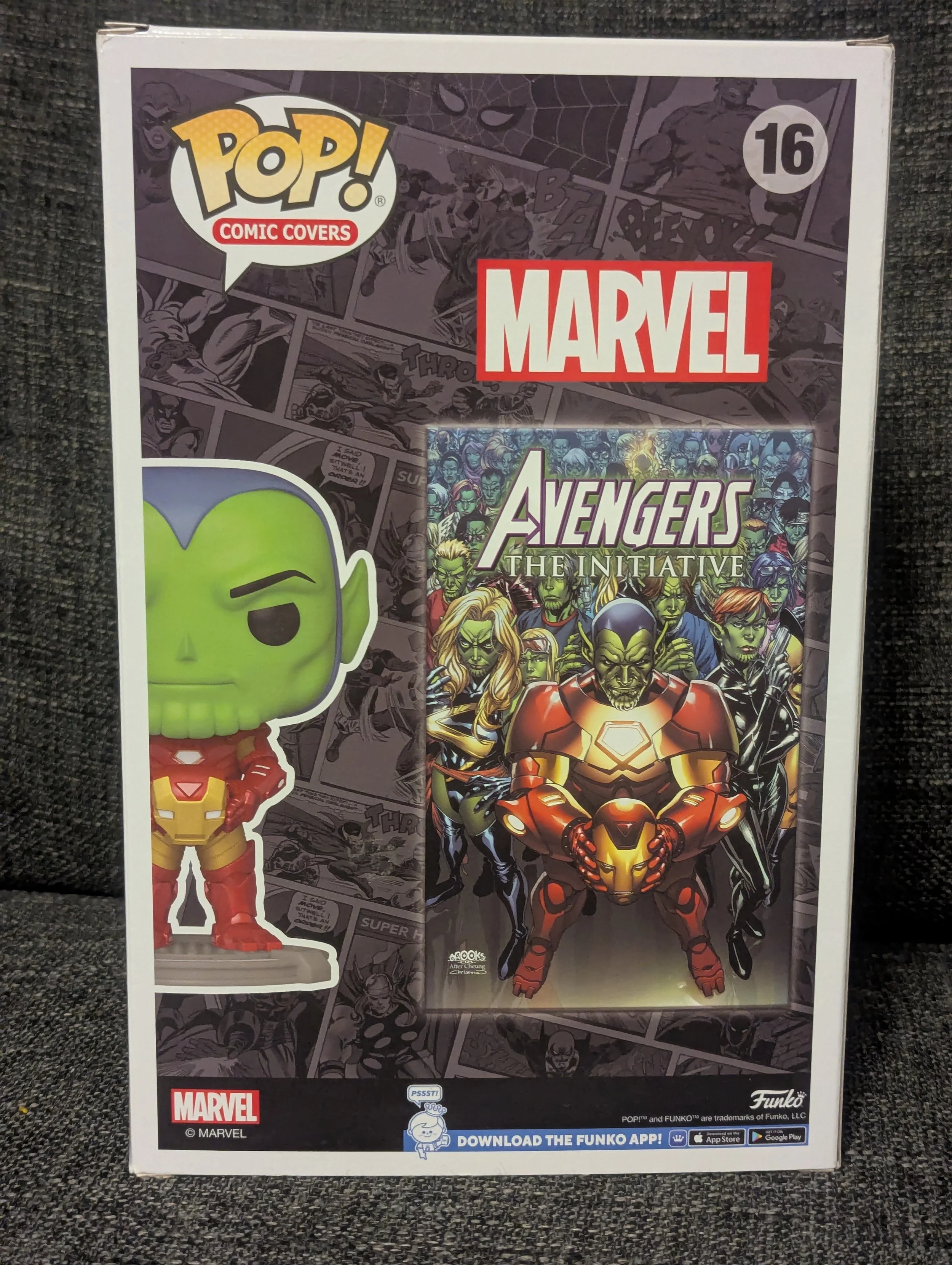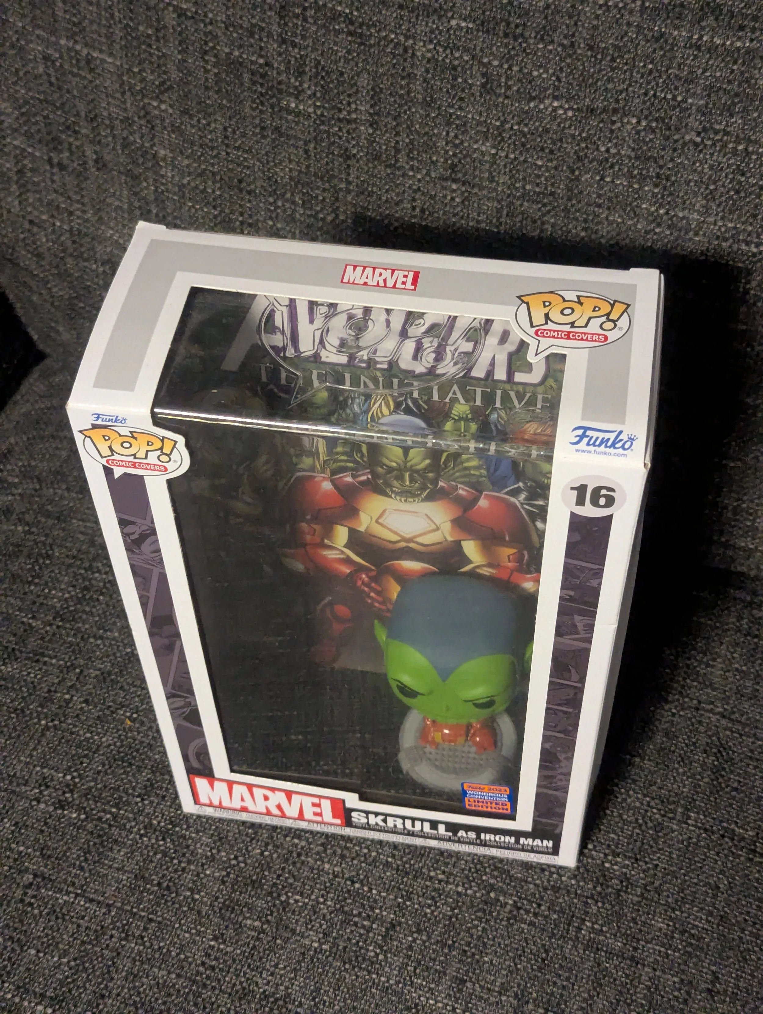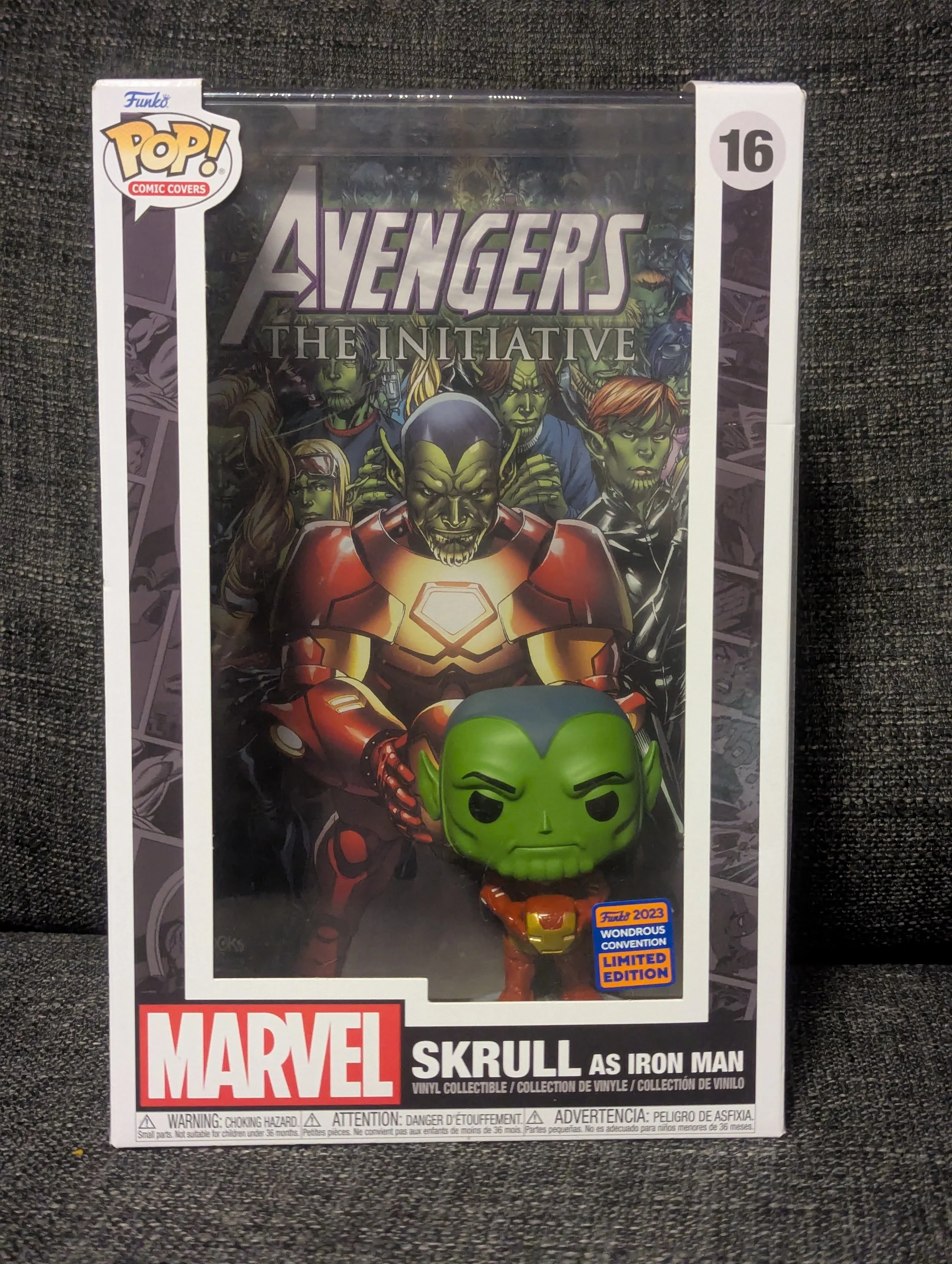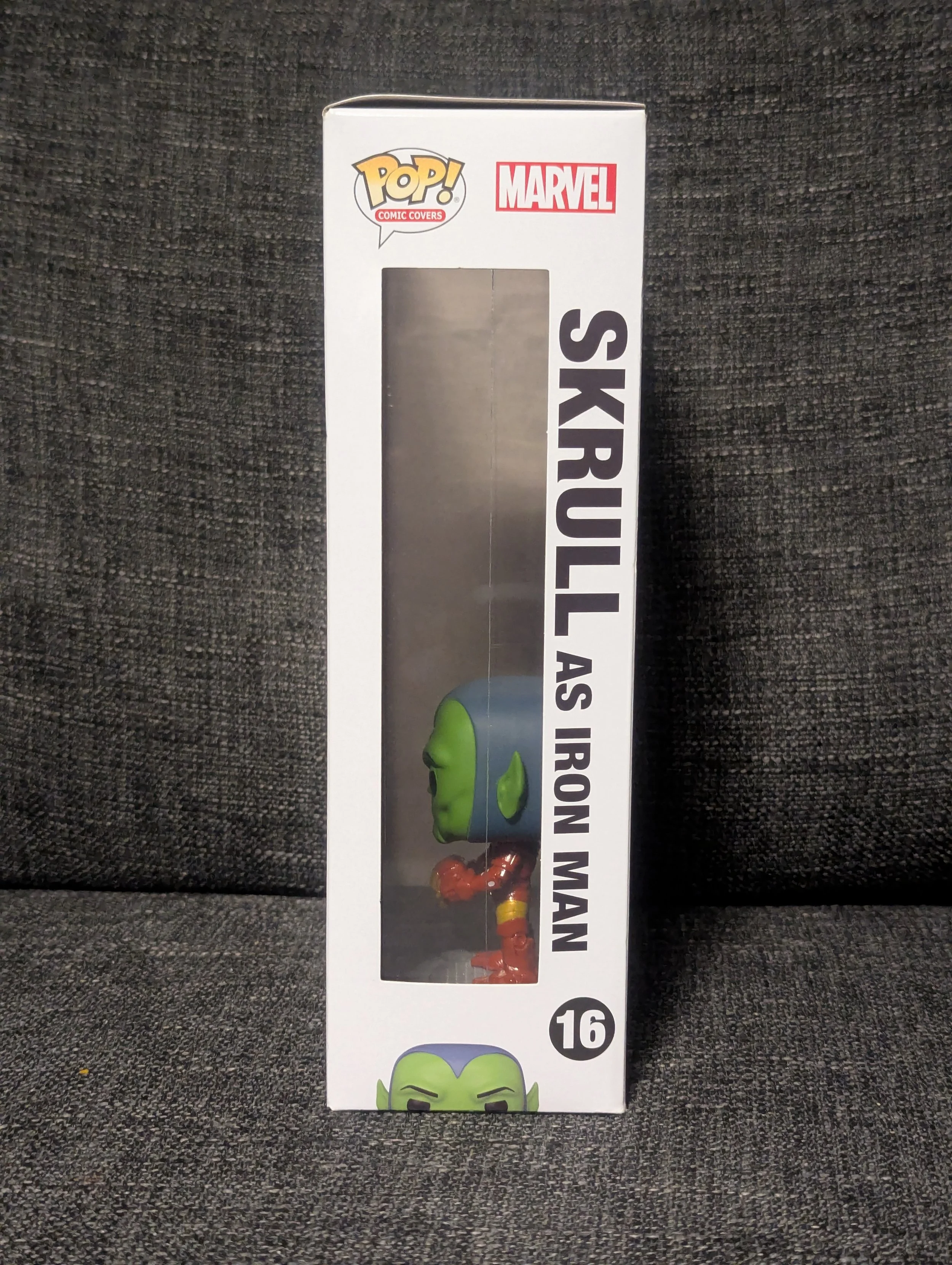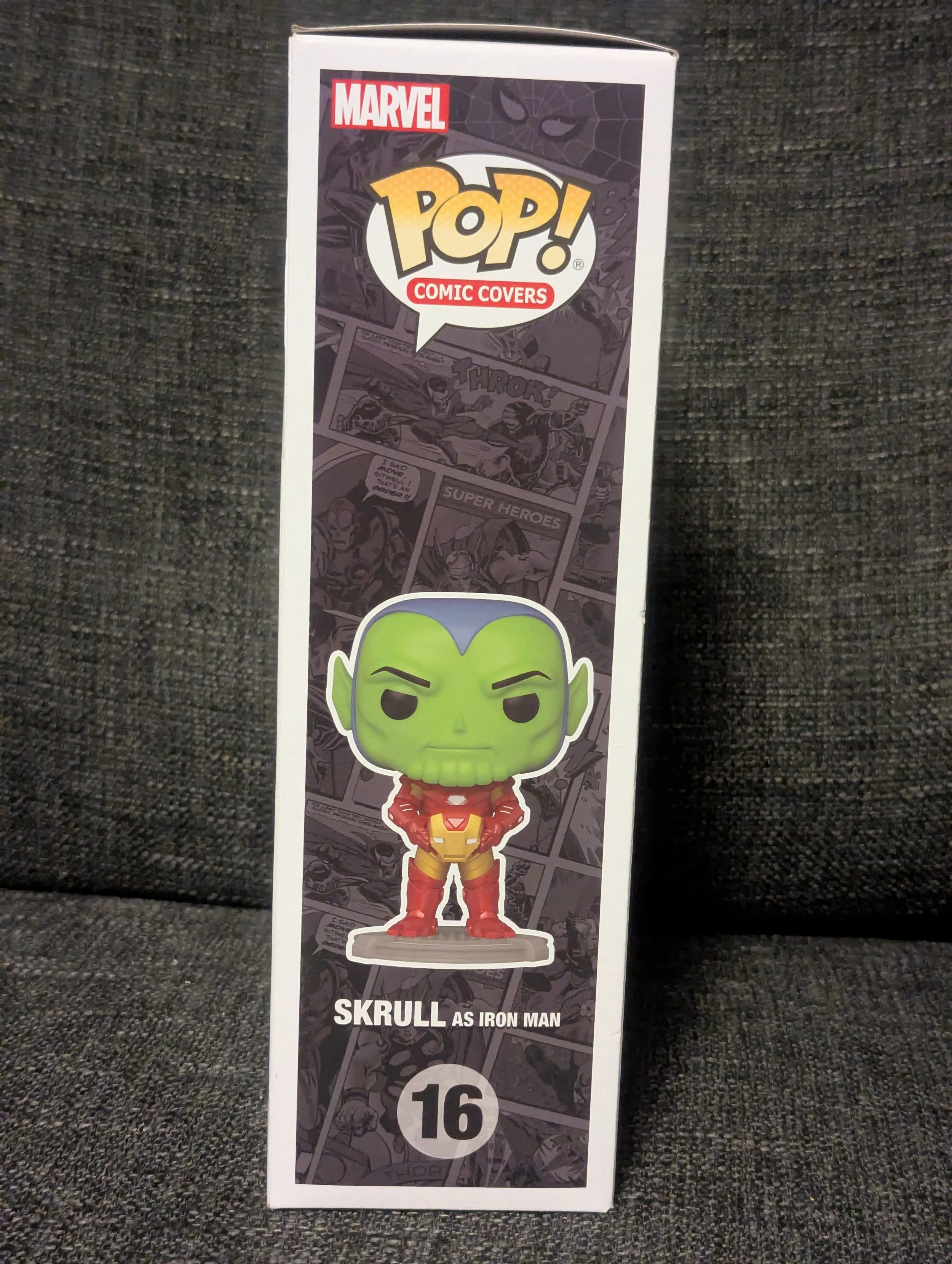 Add a unique Marvel collectible to your display with this Comic Covers Skrull as Iron Man Funko Pop! #16, released as a WonderCon Exclusive. This striking piece features a Skrull disguised as Iron Man alongside the classic comic cover artwork, all presented in a protective display case designed for collectors.