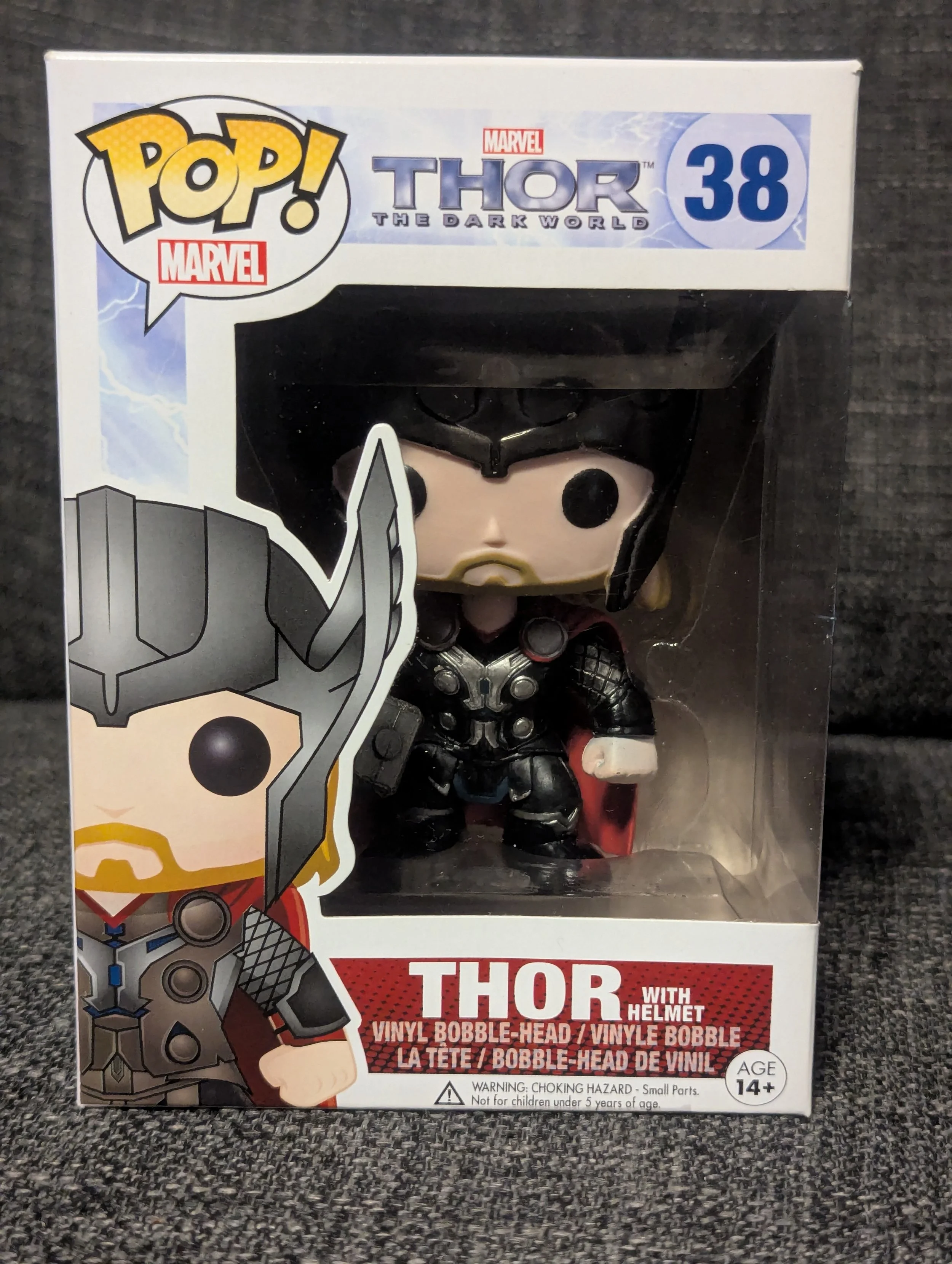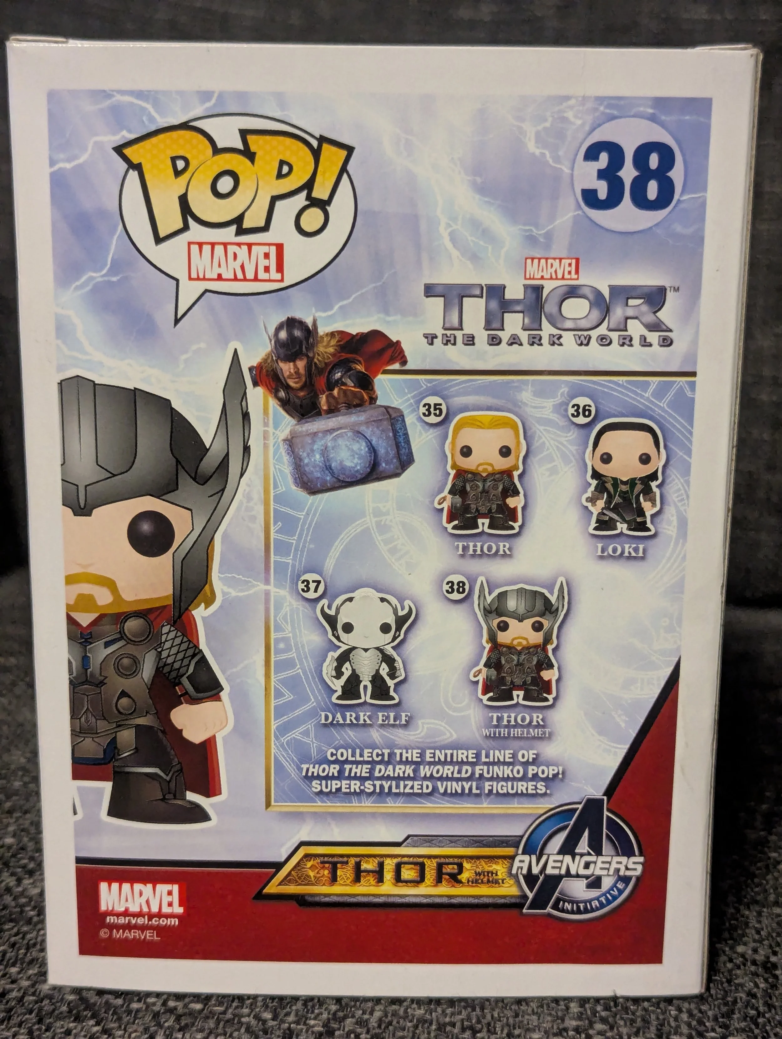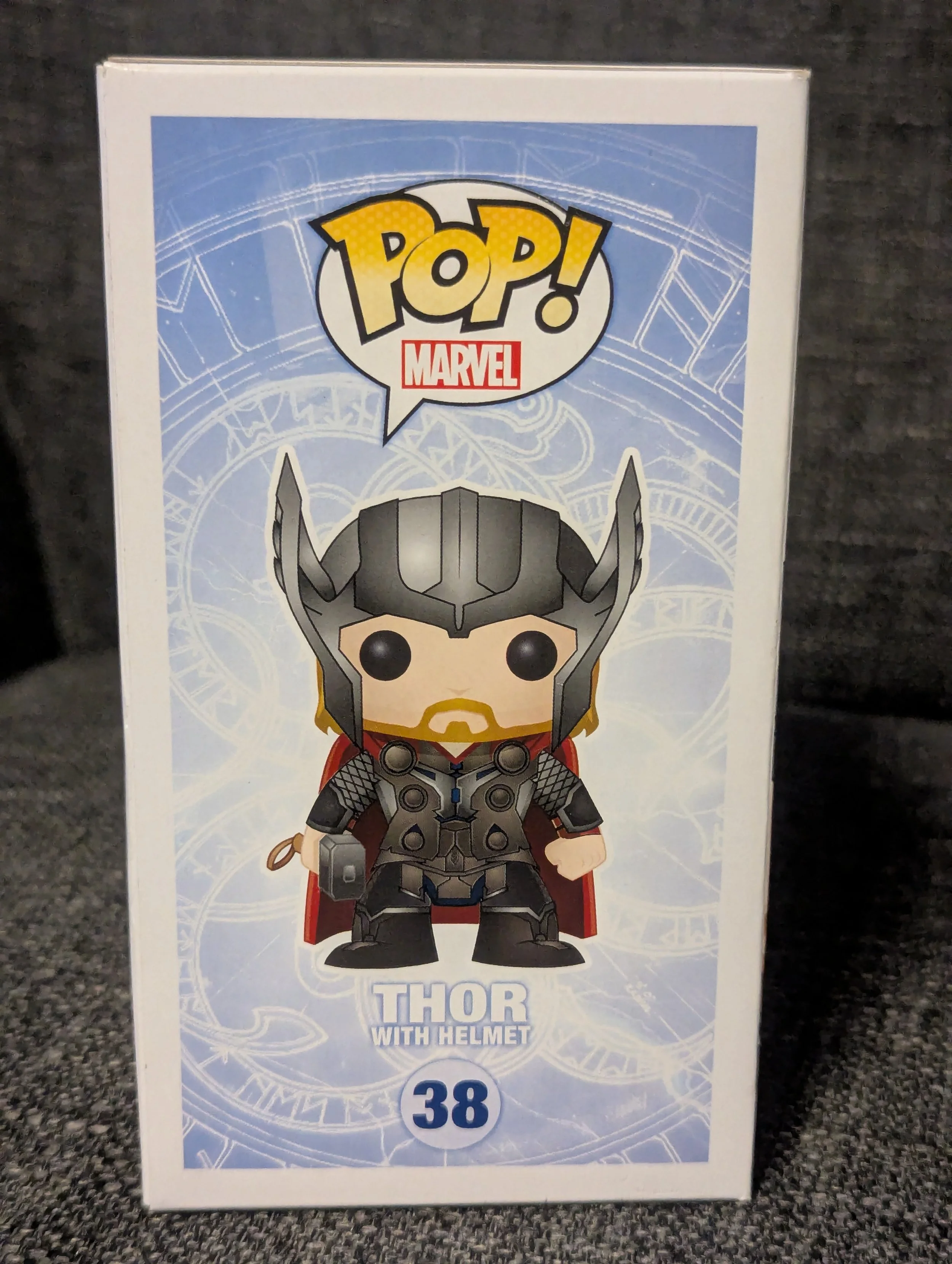 Add a classic piece to your Marvel collection with Thor Funko Pop! #38, part of the early 2013 Funko Pop! Marvel line. This older release features the God of Thunder in his iconic look with helmet, red cape, and Mjölnir, making it a great collectible for long-time Funko and Marvel fans.