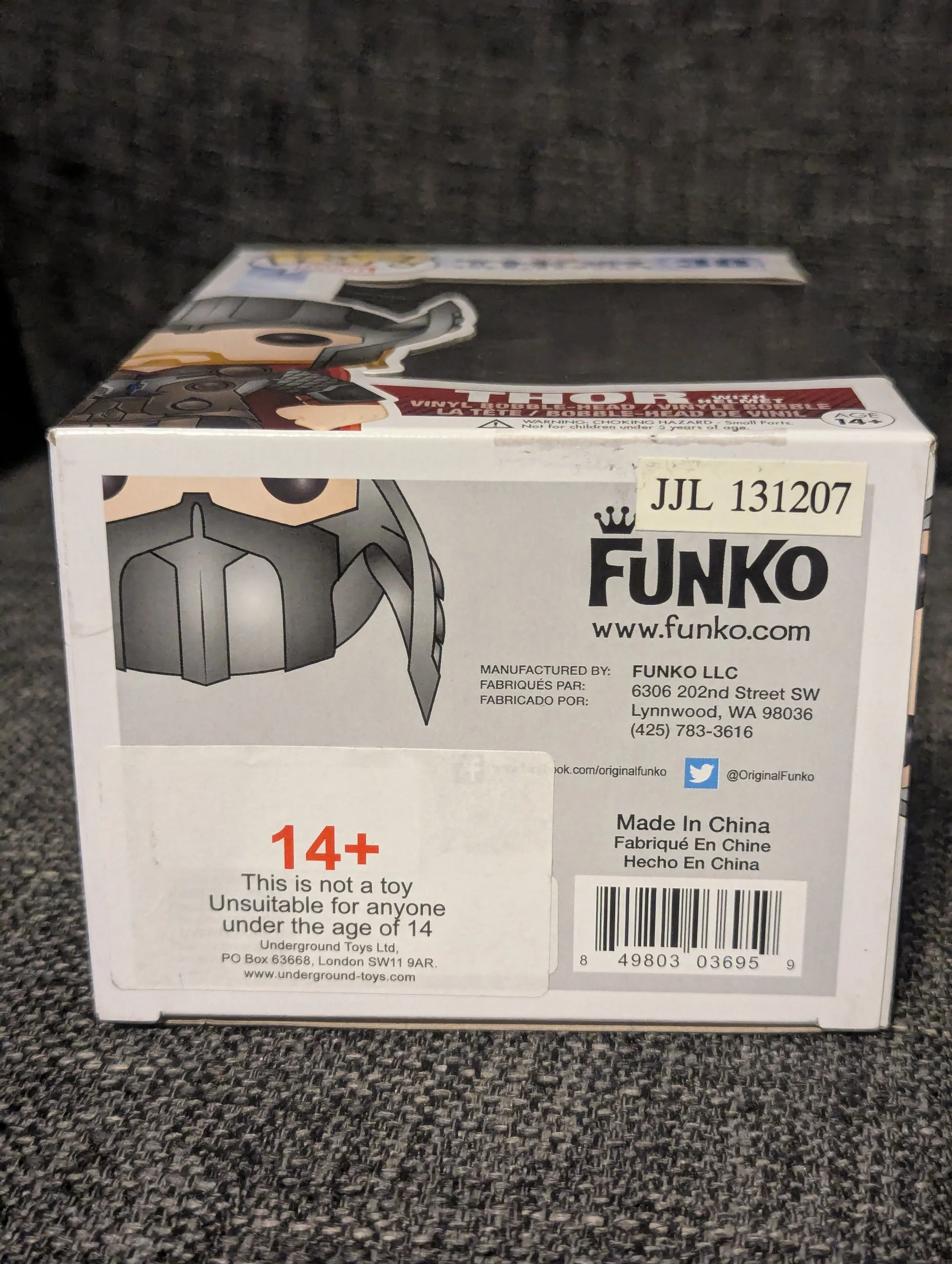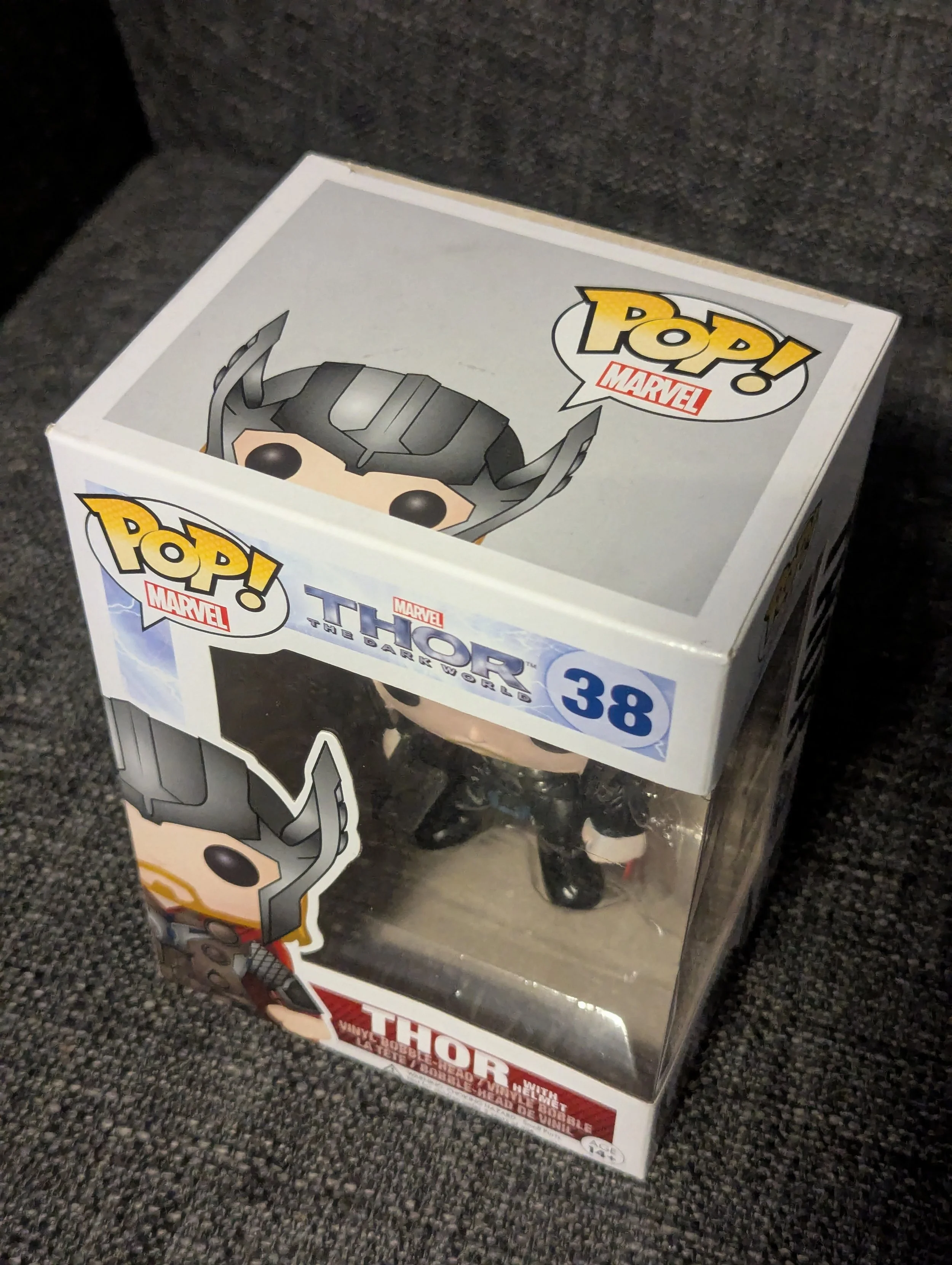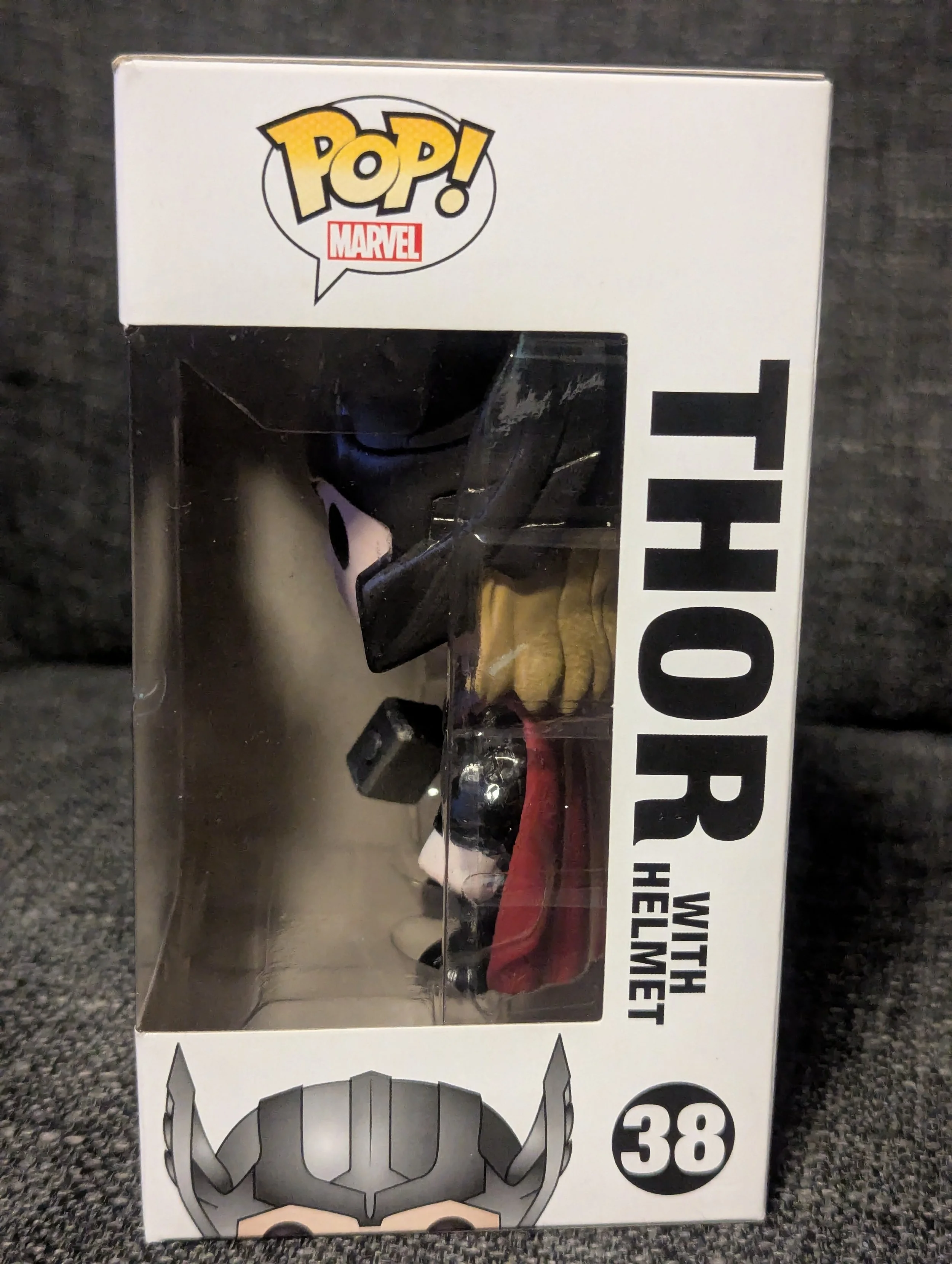 Add a classic piece to your Marvel collection with Thor Funko Pop! #38, part of the early 2013 Funko Pop! Marvel line. This older release features the God of Thunder in his iconic look with helmet, red cape, and Mjölnir, making it a great collectible for long-time Funko and Marvel fans.