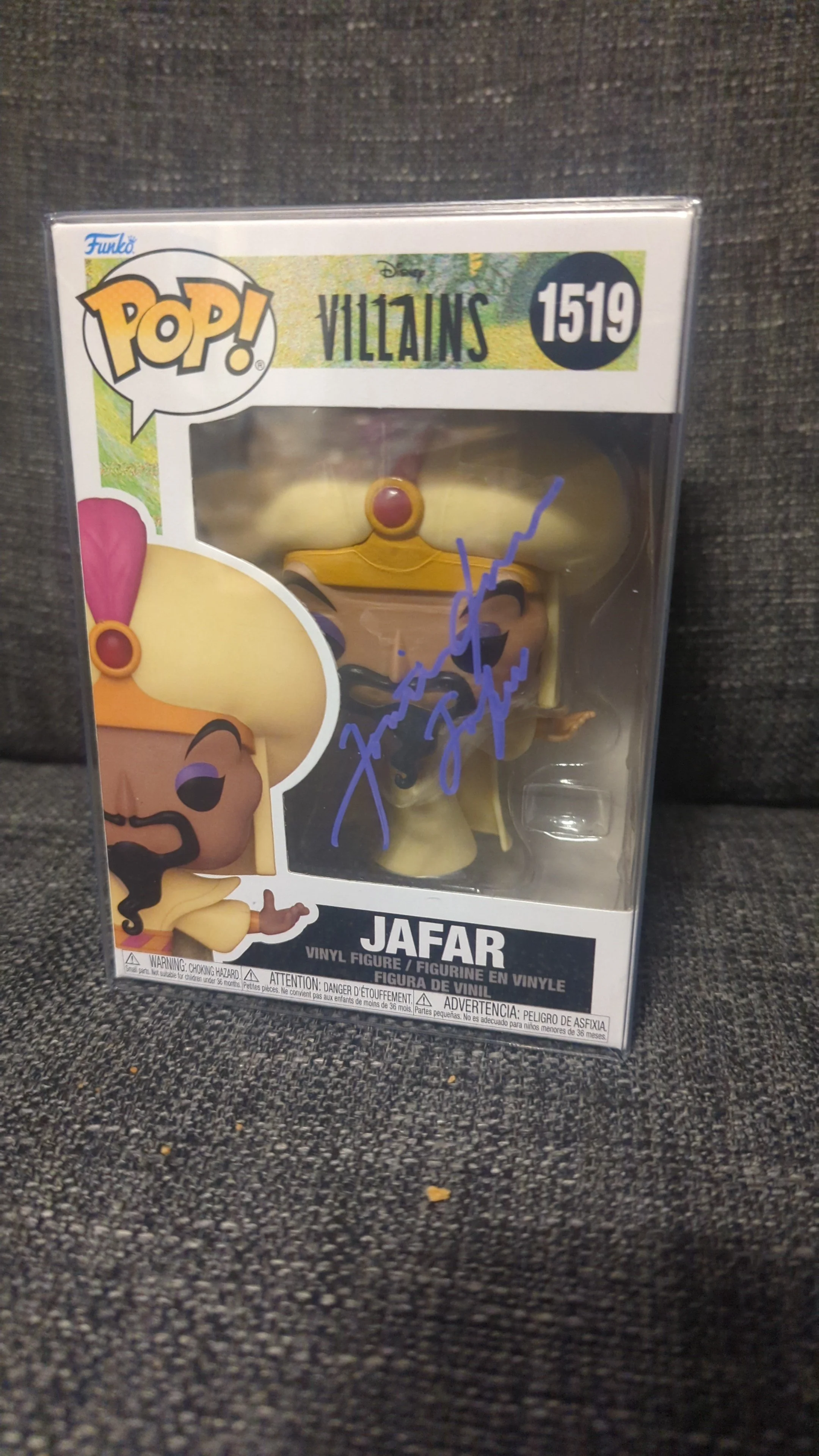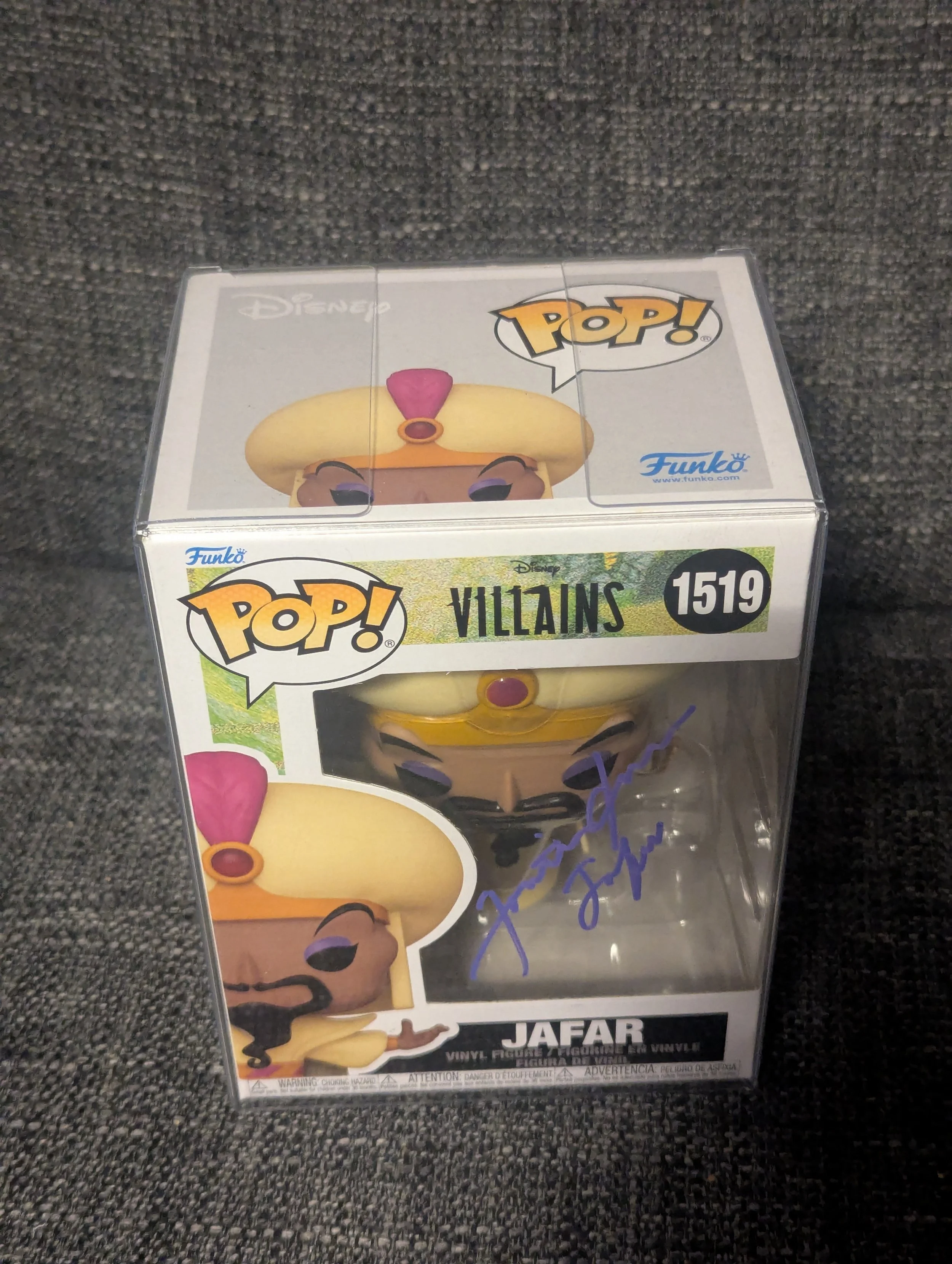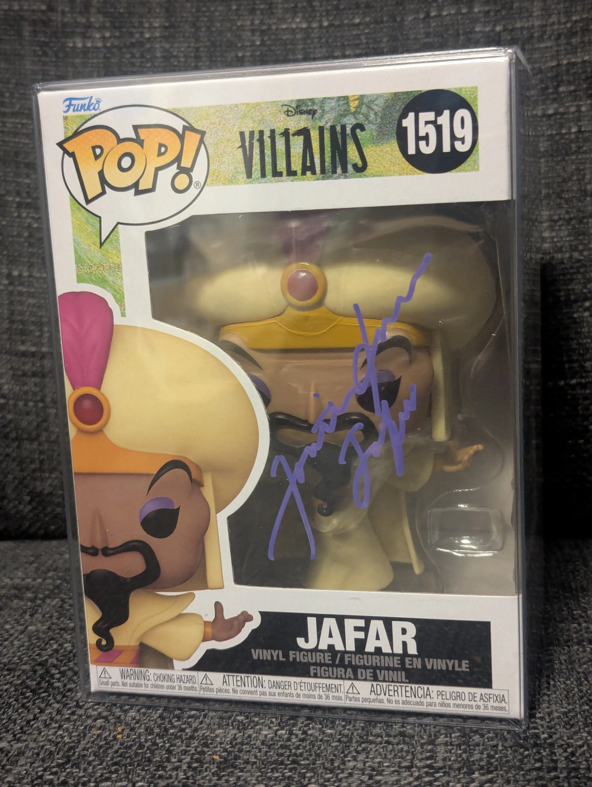 Add a touch of villainous magic to your collection with this Jafar Funko Pop! #1519, hand-signed by Jonathan Freeman, the iconic voice of Jafar from Disney’s Aladdin. A must-have piece for Disney fans and Funko collectors alike.